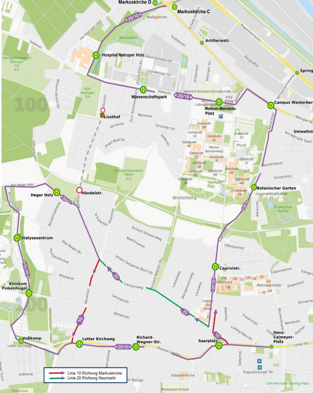Auf der Linie 10/20 entfällt der Streckenabschnitt zwischen der Haltestelle Osnabrück Markuskirche und der Haltestelle Osnabrück Schulzentrum Sonnenhügel in beiden Richtungen ersatzlos