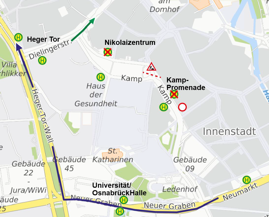Die Haltestelle Oesede Graf-Staufenberg-Straße kann in dieser Zeit nicht bedient werden.